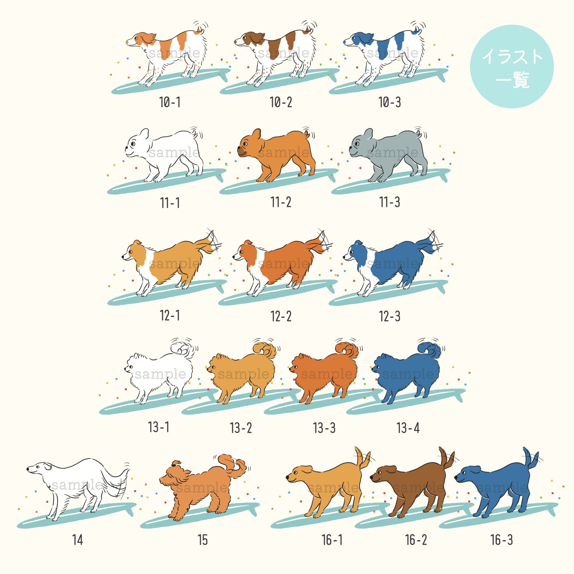 イタリアン・グレイハウンド / ウェルシュ・コーギー / キャバリア・キング・チャールズ・スパニエル / ゴールデンレトリバー / 柴犬 / シュナウザー / ダックスフンド / バーニーズ・マウンテン・ドッグ / プードル / ブリタニー・スパニエル / フレンチ・ブルドッグ / ボーダー・コリー / ポメラニアン / ボルゾイ / ラブラドゥードル / ラブラドール・レトリバー