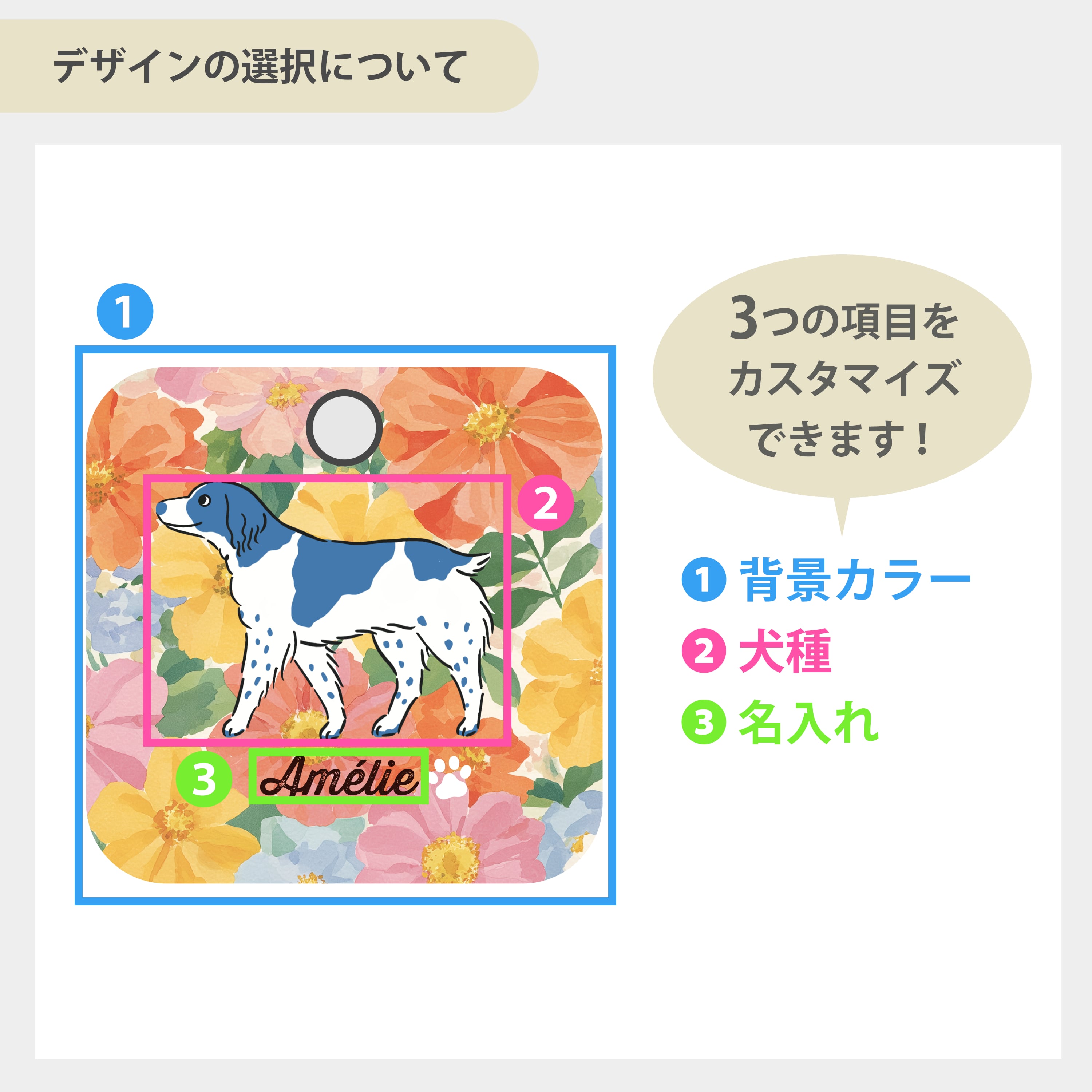 ※ 名入れ欄が空欄の場合は、犬種名が英語表記で入ります